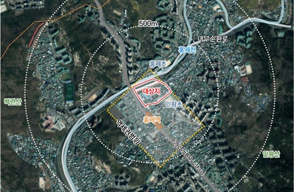 대상지는 지하철 3호선 홍제역과 내부순환도로 사이에 위치한 교통의 요지나, 1970년대 준공돼 낡은 유진상가와 인왕시장 등 저층 노후 건축물이 밀집해 정비 필요성이 꾸준히 제기돼 온 곳이다.