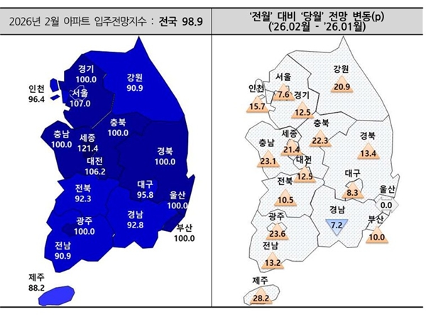 수도권 입주전망지수는 101.3로 전월(89.4)과 비교해 11.9p 상승했다. 서울은 107.6으로 전월(100) 대비 7.6p, 인천은 96.4로 전월(80.7) 대비 15.7p, 경기는 100으로 전월(87.5) 대비 12.5p 각각 오르며 지난달(2025년 12월)에 이어 큰 폭 상승했다. 특히 경기 입주전망지수가 지난해 7월 118.7을 기록한 뒤 7개월 만에 100을 기록했다.
