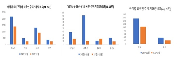 이달 12일 국토교통부(장관 김윤덕ㆍ이하 국토부)는 주요 외국인 토지거래허가구역을 대상으로 2024년 9~12월과 2025년 같은 기간 주택거래량을 분석한 결과, 거래량이 일제히 감소한 것으로 집계됐다고 밝혔다.