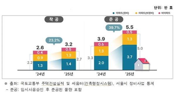 지난해 준공 물량은 5만5000가구로 전년(3만9000가구) 대비 39.7% 증가했는데, 이 중 91.4%에 해당하는 5만 가구가 아파트였다. 지난해 준공된 서울 아파트는 도시정비사업으로 3만7000가구, 비정비사업으로 1만3000가구가 공급됐다. 시는 가용토지가 제한적인 서울의 구조적 여건 속 도시정비사업이 핵심 공급 수단으로 역할을 하고 있음을 보여준다고 설명했다.