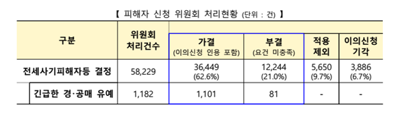 그간 위원회에서 최종 결정한 전세사기 피해자 등은 총 3만6449건(누계), 긴급 경ㆍ공매 유예 협조요청 결정은 총 1101건(누계)이다. 결정된 피해자 등에게는 주거, 금융, 법적 절차 등 총 5만7202건(누계)을 지원했다.