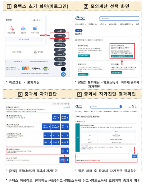홈택스(PC)와 손택스(모바일)에서는 납세자가 간단한 질문ㆍ답변을 통해 다주택자 중과 여부를 진단해 볼 수 있는 양도세 중과 자가진단 서비스를 제공하고 있으며, 양도세 예상 세액도 미리 계산해 볼 수 있다.