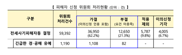 그간 위원회에서 최종 결정한 전세사기 피해자 등은 총 3만6950건(누계), 긴급 경ㆍ공매 유예 협조요청 결정은 총 1108건(누계)이다. 결정된 피해자 등에게는 주거, 금융, 법적 절차 등 총 5만9655건(누계)을 지원했다.