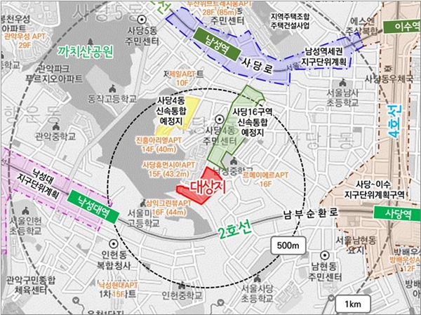 대상지는 지하철 2ㆍ4호선 사당역, 2호선 낙성대역 및 7호선 남성역 사이에 위치한 노후ㆍ불량 건축물이 밀집한 곳이다. 2017년 정비구역 지정 이후 지난해 6월 변경된 정비계획을 바탕으로 통합 심의(안)을 수립했다.