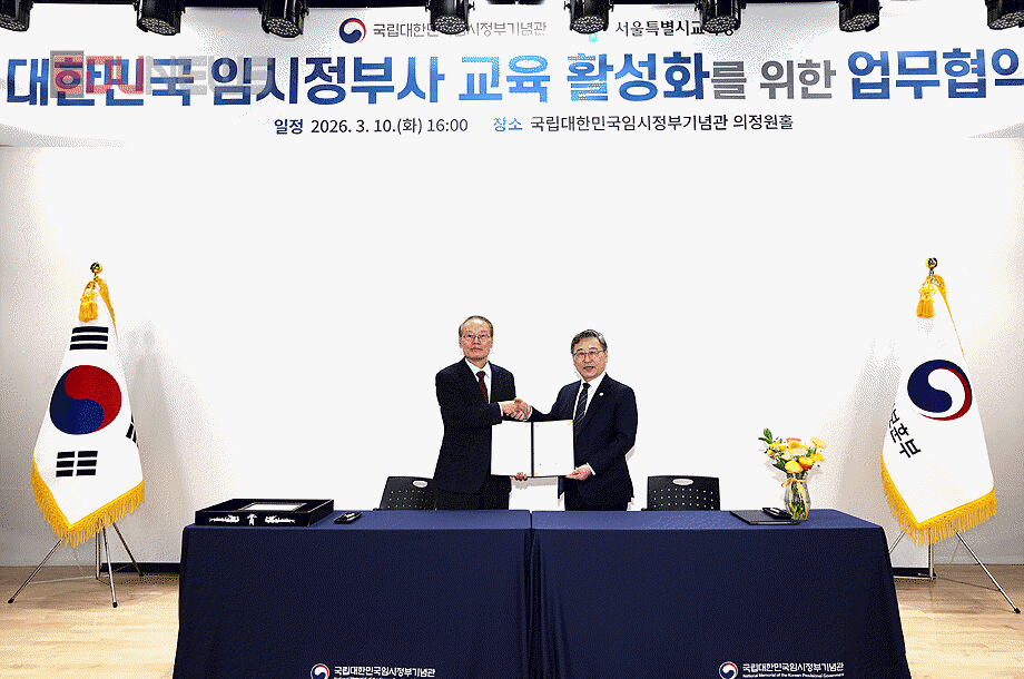 [에듀뉴스] 정근식 서울특별시교육감과 김희곤 국립대한민국임시정부기념관장이 10일 오후 서울 서대문구 국립대한민국임시정부기념관에서 ‘대한민국 임시정부사 교육 활성화’를 위한 업무협약을 체결한 후 기념촬영하고 있다.