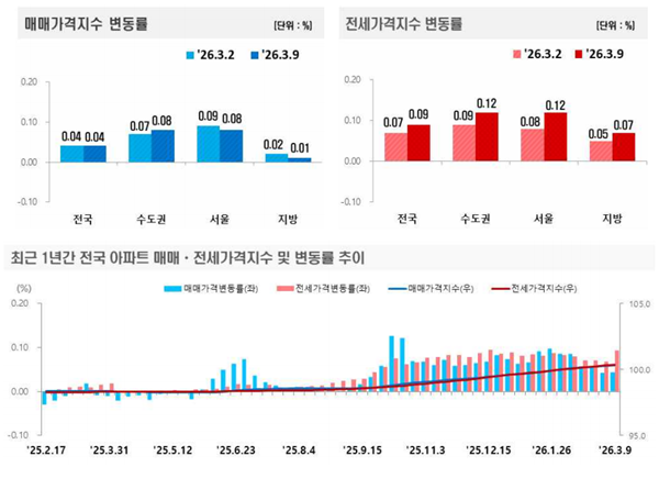 [아유경제_부동산] 2026년 3월 2주 아파트 가격 동향… 매매가격 0.04% 상승ㆍ전세가격 0.09% 상승