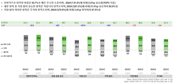 세부 항목별로 보면 커뮤니티 만족도가 2024년 61.2%에서 지난해 82.6%로 21.4%p 상승하며 가장 큰 폭의 개선을 보였다. 반면 주거비 만족도는 2024년 70.9%에서 지난해 67.5%로 3.4%p 하락해 개선이 필요한 영역으로 나타났다. 이에 시는 커뮤니티ㆍ운영 개선 성과를 확산하는 동시에 주거비 체감 부담을 낮추는 제도ㆍ운영 보완을 지속 추진할 방침이다.