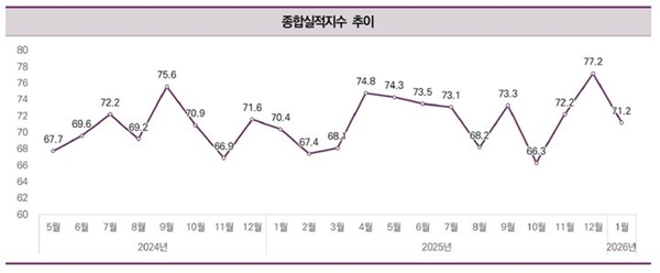 한국건설산업연구원(이하 건산연)은 지난 1월 CBSI가 전월 대비 6p 하락한 71.2를 기록했다고 밝혔다.