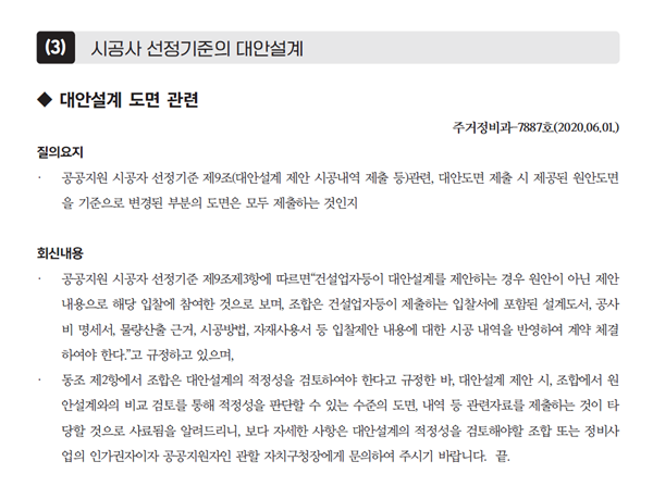 서울시 질의 회신집 역시 같은 맥락이다. 서울시는 대안설계 제출 범위에 대해 "조합은 대안설계의 적정성을 검토해야 하므로, 원안설계와의 비교 검토를 통해 적정성을 판단할 수 있는 수준의 도면, 내역 등 관련 자료를 제출하는 것이 타당하다"고 명시하고 있다. 도면 제출은 선택이 아닌 필수라는 뜻이다.